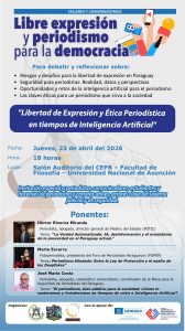 Desde las 18 horas del jueves 23, en el marco de la Semana del Periodista, la UNA abrirá esta serie con un conversatorio sobre “Libertad de Expresión y Ética Periodística en tiempos de Inteligencia Artificial”. El evento se hará en el salón auditorio del Centro Experimental Paraguay Brasil, en la sede de la Facultad de Filosofía UNA, barrio Itapytapunta de Asunción. Están especialmente invitados periodistas, comunicadores, docentes, estudiantes y egresados de la carrera, además de público en general interesado en la temática.